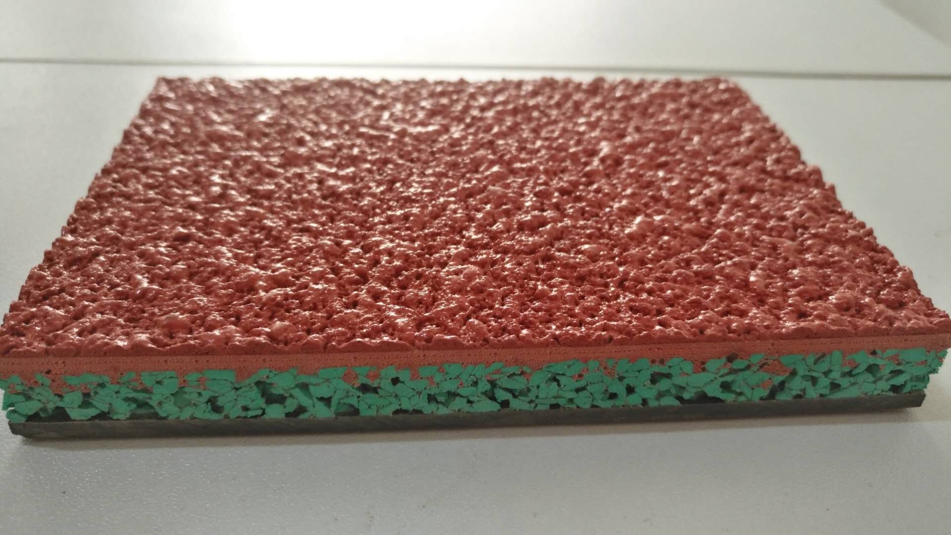 复合型塑胶跑道:底部弹性层由弹性橡胶颗粒与单组分聚氨酯黏合剂按8:1比例经由专业施工机械铺设,底层施工完毕后用专用填缝胶封闭底层表面,防止面层施工时,PU面胶往下渗漏,面层由专用面胶与EPDM颗粒搅拌后喷涂而成。
