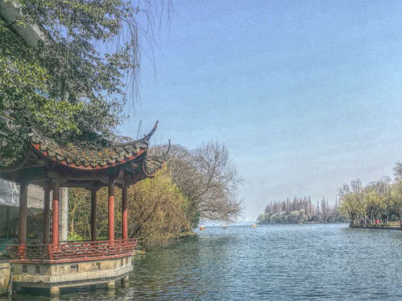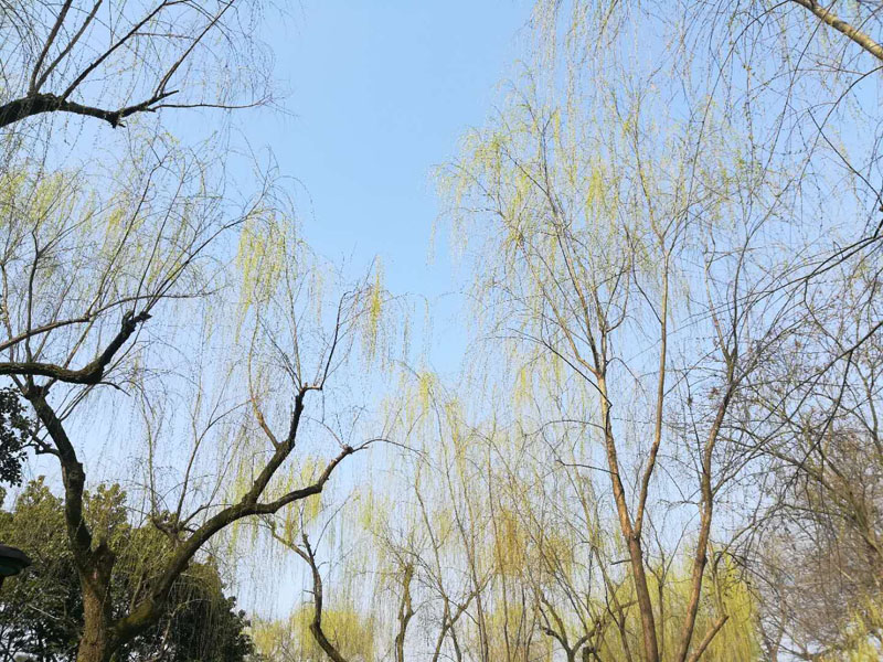 柳叶青,杏花明,湖水清。